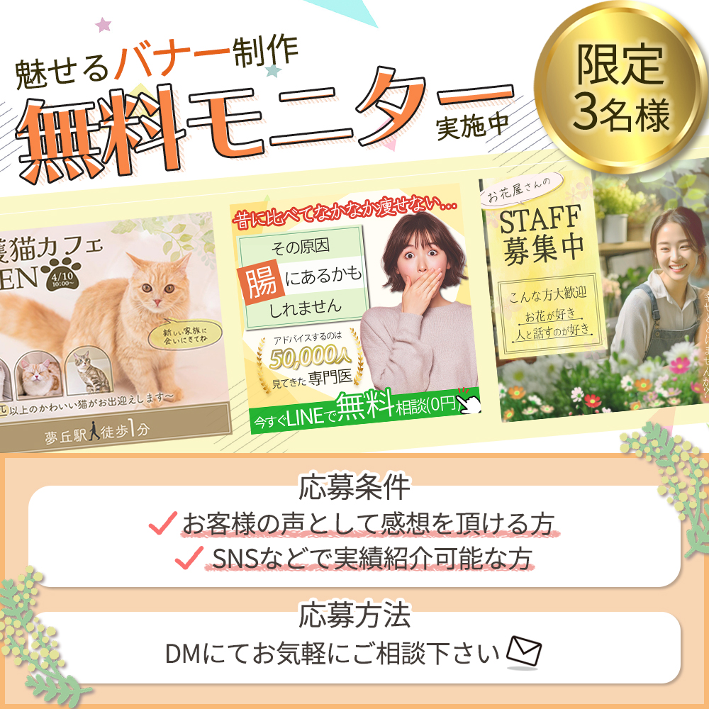 エステサロンでの勤務経験を活かし、女性向けのやさしく上品なデザインを得意としています。 バナーやLPなどのWEB画像はもちろん、全体のトーンや雰囲気づくりもお任せください。